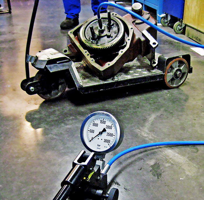 При демонтаже подшипников с конических посадочных мест при помощи метода гидрораспора усилие натяга полностью преодолевается путём подачи масла под давлением. После этого подшипник легко снимается с посадочного места без использования съёмника. Метод гидрораспора также может использоваться для демонтажа других деталей, например, зубчатые колеса, гребные винты, железнодорожные колеса. Насос ручной гидравлический сверхвысокого давления НРГ 2000-2.2 с тензорным двухпоршневым домкратом ДГТ74-8П. Шпильконатяжитель 74т, ход 8мм, резьба М36х4, наружный диаметр 88мм.