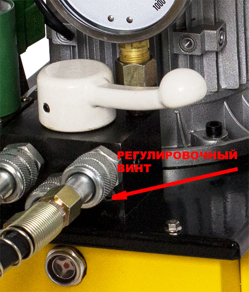 На лицевой части гидравлического блока управления 2 имеется регулировочный винт 14 с контрвинтом для настройки предельного уровня рабочего давления создаваемого маслостанцией (винт с внутренним шестигранником расположенный рядом с БРС 18). Штатно давление маслостанции настроено на 600-700 бар.