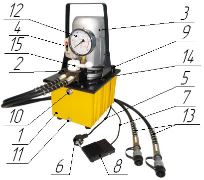3.1. Гидравлическая насосная станция состоит из масляного бака 1, на крышке которого установлены гидравлический блок управления 2 и приводной электродвигатель 3 с пультом управления 4 . Пульт управления имеет кнопки "Включено"(ON) и "Выключено" (OFF). От пульта управления отходят два кабеля. Кабель 5 предназначен для подключения станции к сети электропитания напряжением 220 или 380 В с соответствующими электроразъемами 6, а кабель 7 имеет переносную педаль 8 (опционально) для управления гидростанцией на расстоянии.