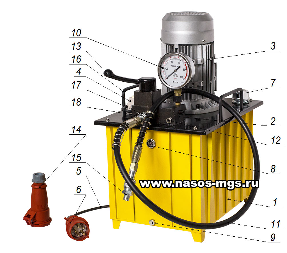 3.1. Маслостанция МГС 700-2.2-Р-1 состоит из масляного бака 1, на крышке которого установлены гидравлический блок управления 2 и приводной электродвигатель 3 с пультом управления 4. Пульт управления имеет кнопки "ON" (Включено) и "OFF" (Выключено). От пульта управления отходит кабель 5, предназначенный для подключения маслостанции к сети электропитания напряжением 220В или 380В с соответствующей штепсельной вилкой 6. Опционально маслостанция комплектуется ответным штепсельным разъемом 14.